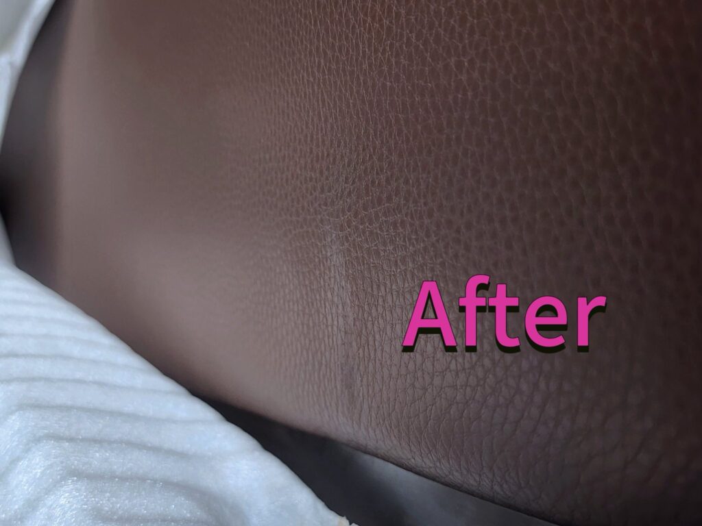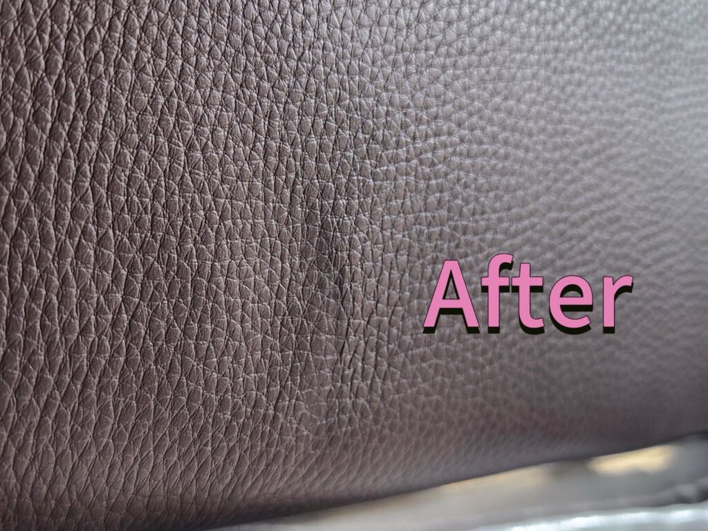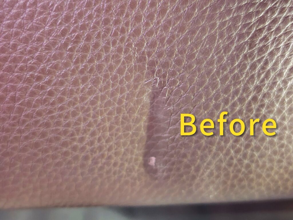 下圖可以看到,修復前的皮革沙發表面有明顯刮痕與掉色(圖一),經過 染料水補色 與 有色光油保養 後(圖二),刮痕幾乎隱形,整體顏色均勻、光澤度明顯提升